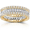 Brilliant three-ring set of two 14K yellow gold and one 14K white gold pave set round cut diamond eternity wedding bands. Wear them alone on each hand or stacked.