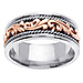 This men's 14K white gold ring has well-crafted, artistic scroll flourishes made in 14K rose gold along the center between two handmade rope braid designs. The contrast of rose gold between white gold highlights the art deco type of design, creating a masculine elegance that can be admired for a lifetime.